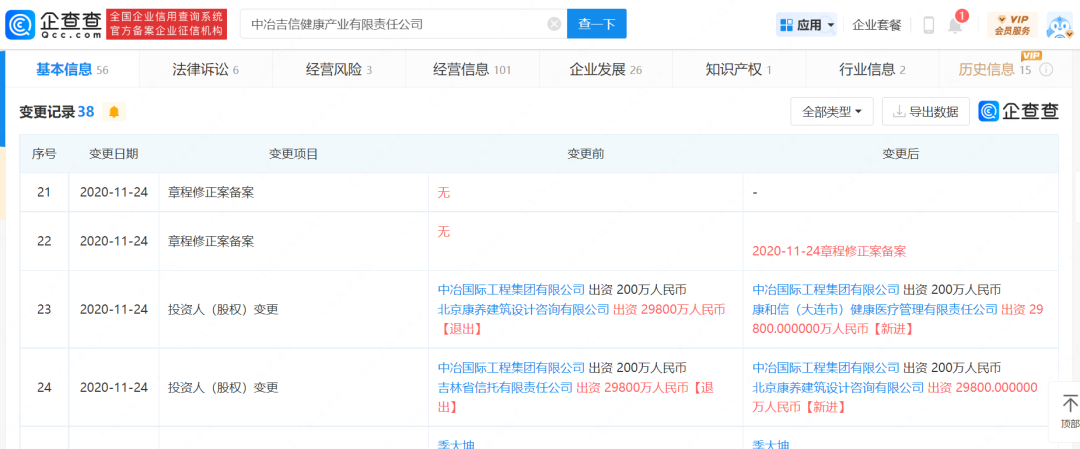 企查查泄漏,在2020年11月24日,中冶吉信发生了2次十足控股鼓励变更。先是北京康养公司出资2.98亿收购吉林信赖执有的中冶吉信的一起股份,触及到的股权份额占中冶吉信的99.33%。团结天,康和信又出资2.98亿收购了北京康养公司执有的中冶吉信的一起股份。随后,北京康养公司在2022年7月刊出。